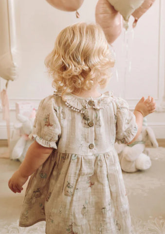 Taupe cotton gauze birthday print dress with matching bloomer 6-9 months
