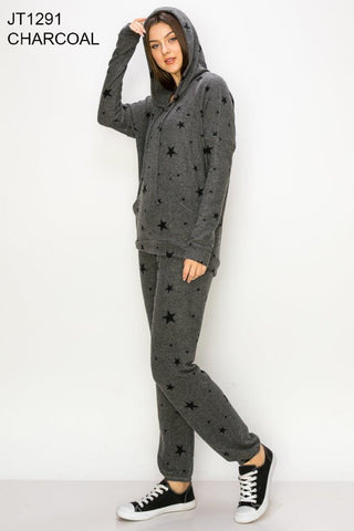 Comfy hoodie top in our charcoal stars print cozy brushed jersey