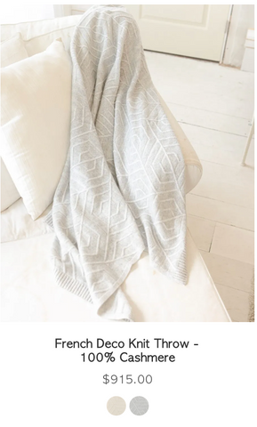 Add modern luxury to your home with the Cashmere French Deco Throw. Made in super soft, 100% Cashmere and featuring a gorgeous French deco knit pattern. This throw looks fantastic over a couch or chair and also adds a beautiful touch to any bedroom. Available in two color combinations to accentuate any color palette. This is the ultimate cashmere blanket!